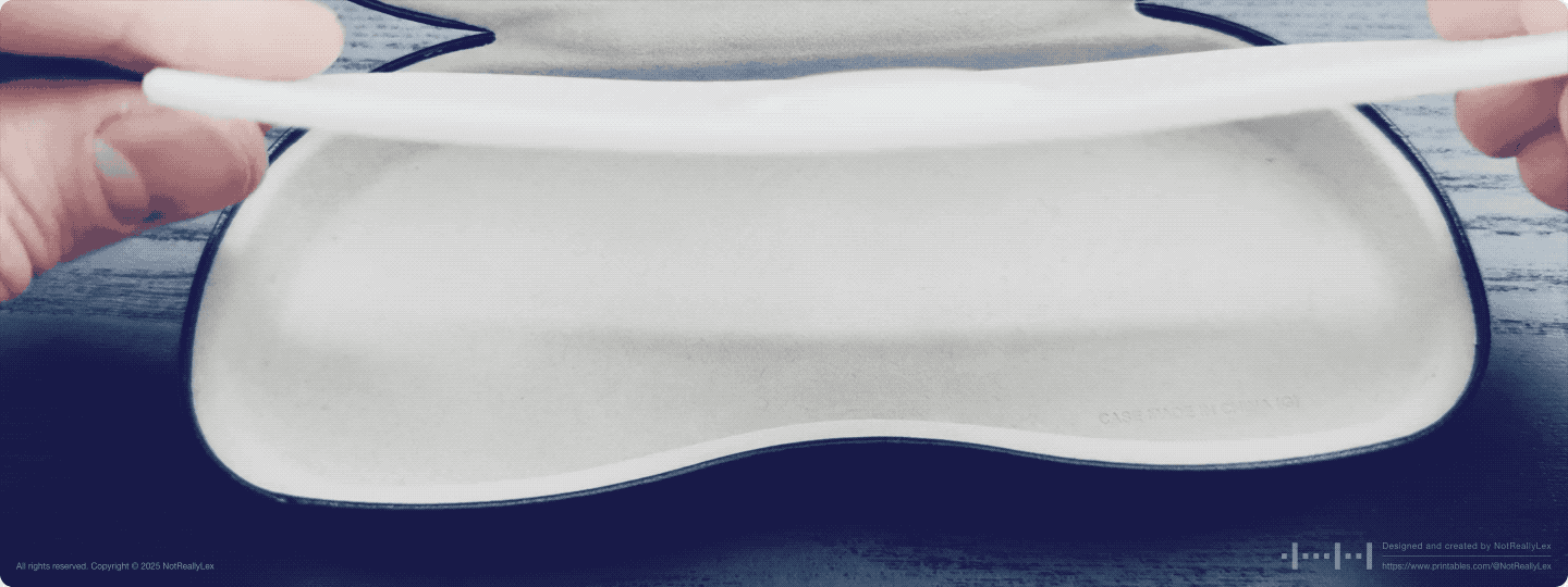 So I designed this holder to keep the AirTag locked in place inside the case. The hard-shell case has a slightly concave bottom, which turned out to be the perfect spot: just enough unused space to tuck an AirTag away without taking up room you actually need. And there is still space to keep the lens wipe inside the case! The holder is printed flat, then thermoformed with a hairdryer to conform to that curved surface for a tight, flush fit. No supports, no non-planar printing, just heat and press.