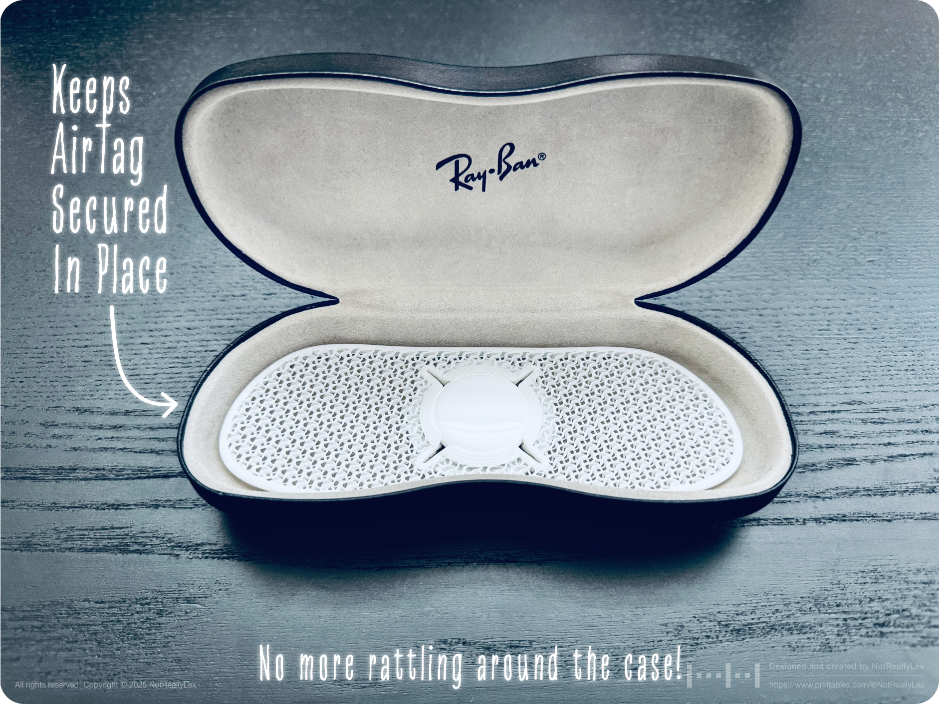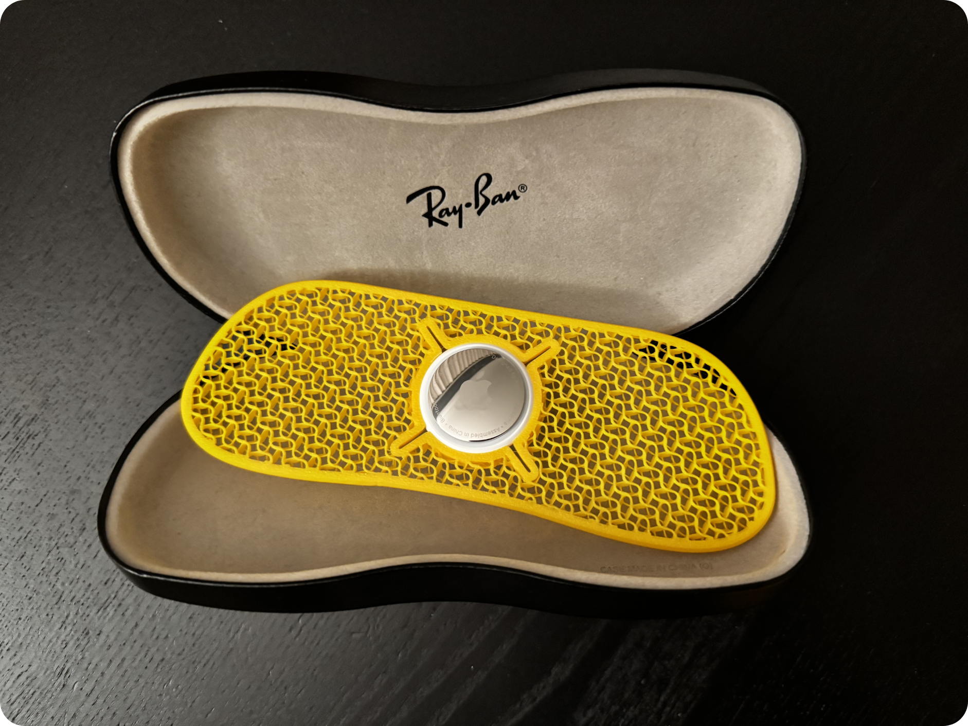 A slim, thermoformable AirTag holder designed to fit inside a hard-shell Ray-Ban glasses or sunglasses case. Keeps your AirTag secured and out of the way, your case rattle-free, and your glasses scratch-free.