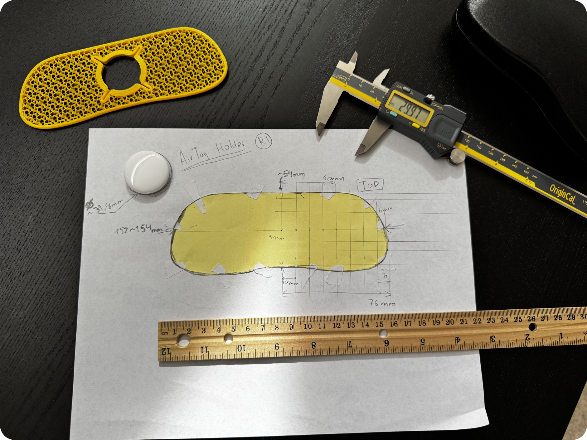 I started by tracing the inside shape of the case onto sticky notes, then photographed the tracing with a ruler for scale and imported it into Fusion as a reference image. I scaled the image to the ruler and traced the outline to create a first crude prototype.