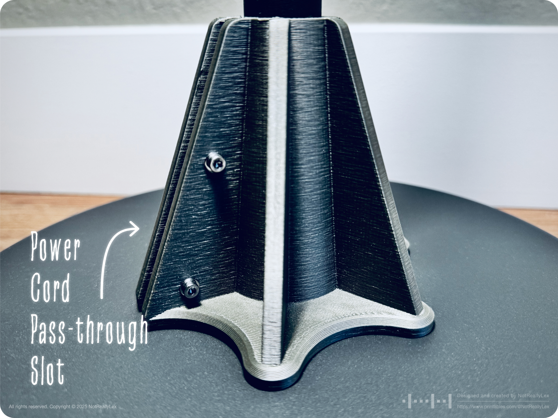 There's a vertical slot along the side for the power cord, since the IKEA HEKTAR lamp has the cable hidden inside the pole that is permanently connected to the heavy base with no way to remove it, this pass-through slot allows to attach the brace effortlessly.