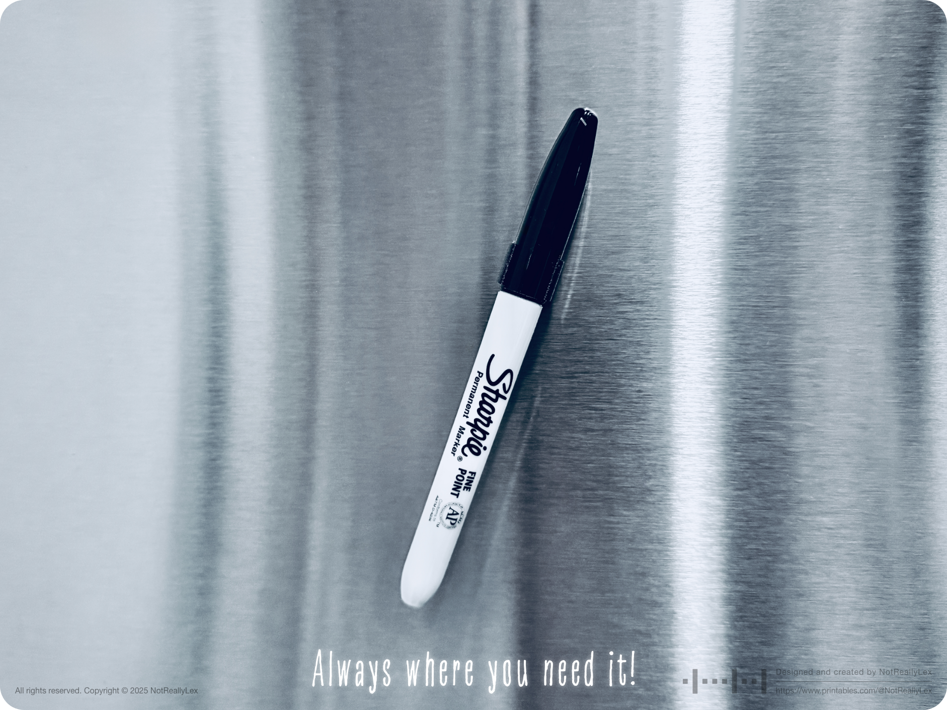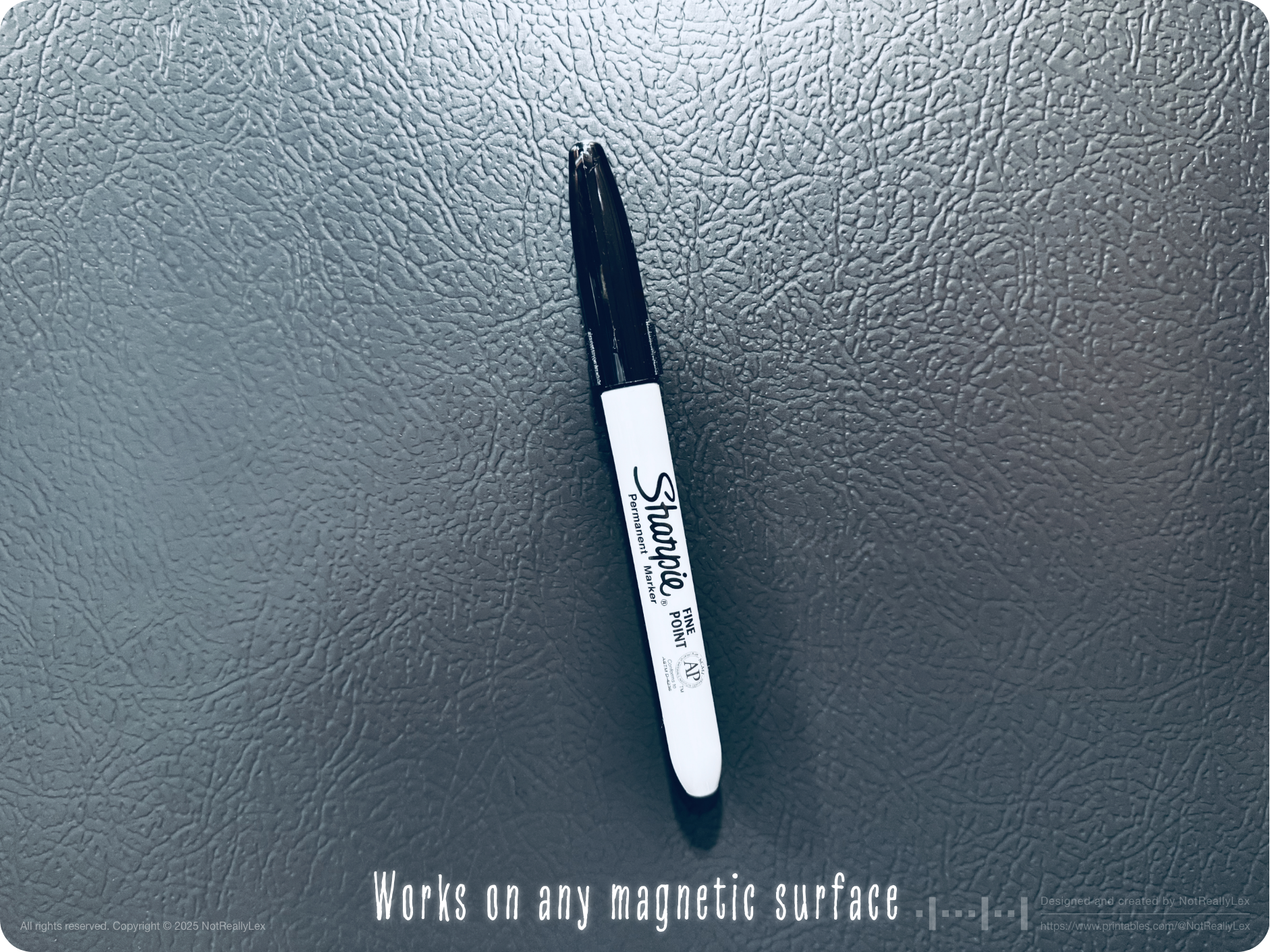 So, I designed this magnetic clip to keep my marker exactly where I need it, on my fridge. The clip attaches to the end cap of a standard fine point Sharpie® and holds it securely, and allows to stick the marker on any magnetic surface like fridge doors, magnetic whiteboards, microwave oven, filing cabinets, tool chests, or any metal surface where magnets work. It's so minimalist that once clipped on, it's almost invisible unless you're looking directly at it.