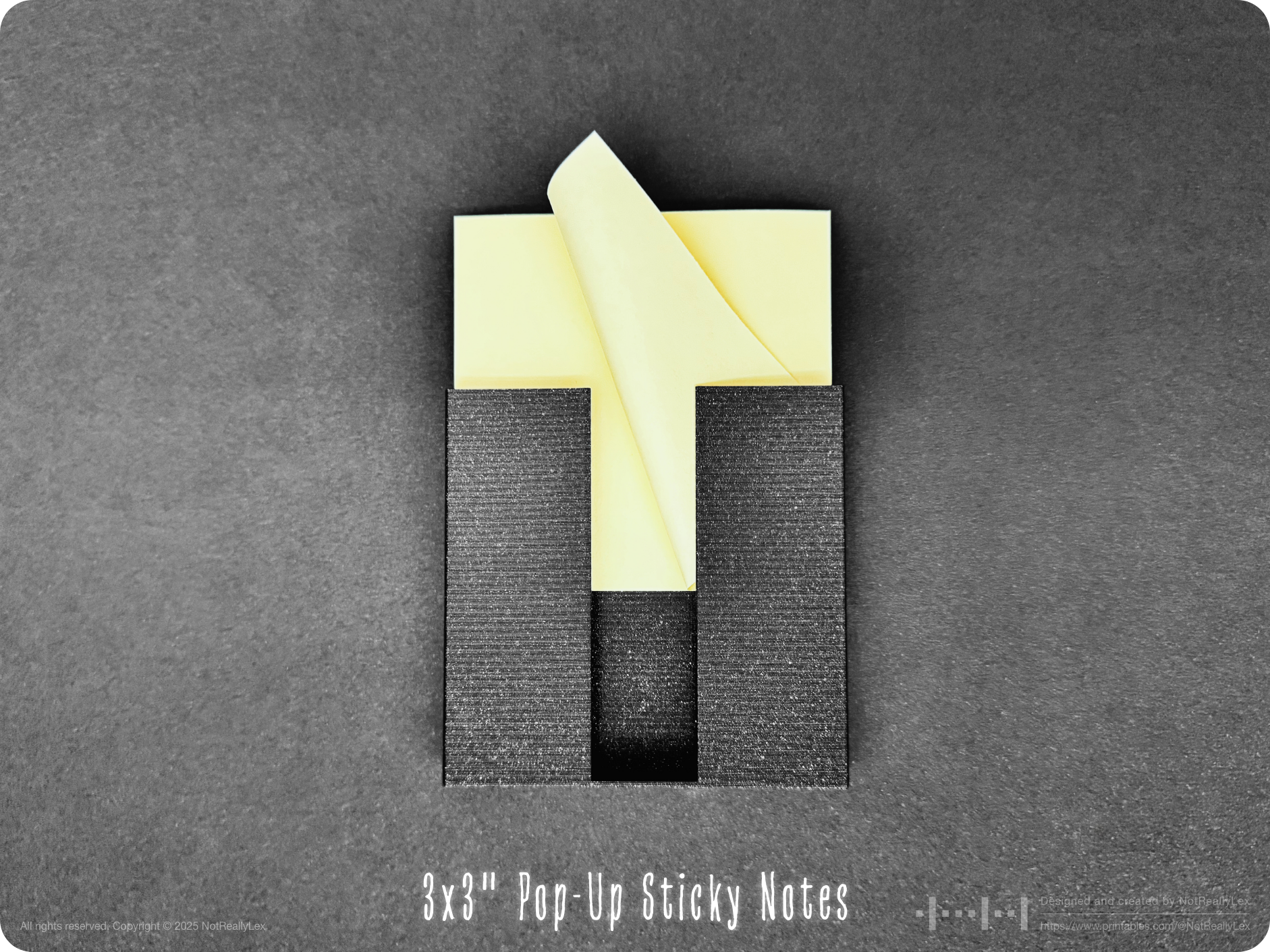 A minimalist holder for 3"x3" pop-up Post-it® notes on any surface, always visible, always within reach. Mounts with double-sided tape on a fridge, whiteboard, or wherever you need it.