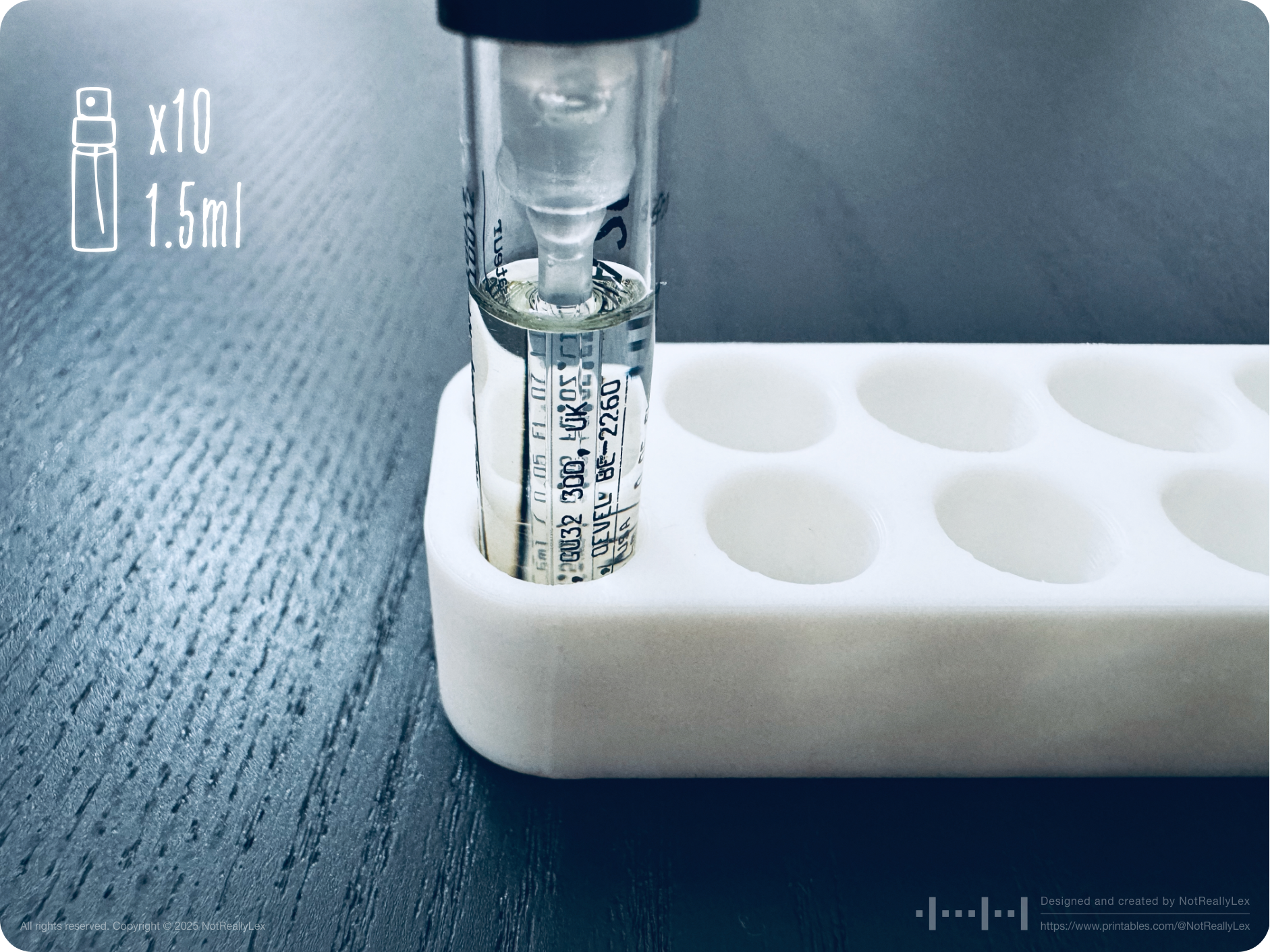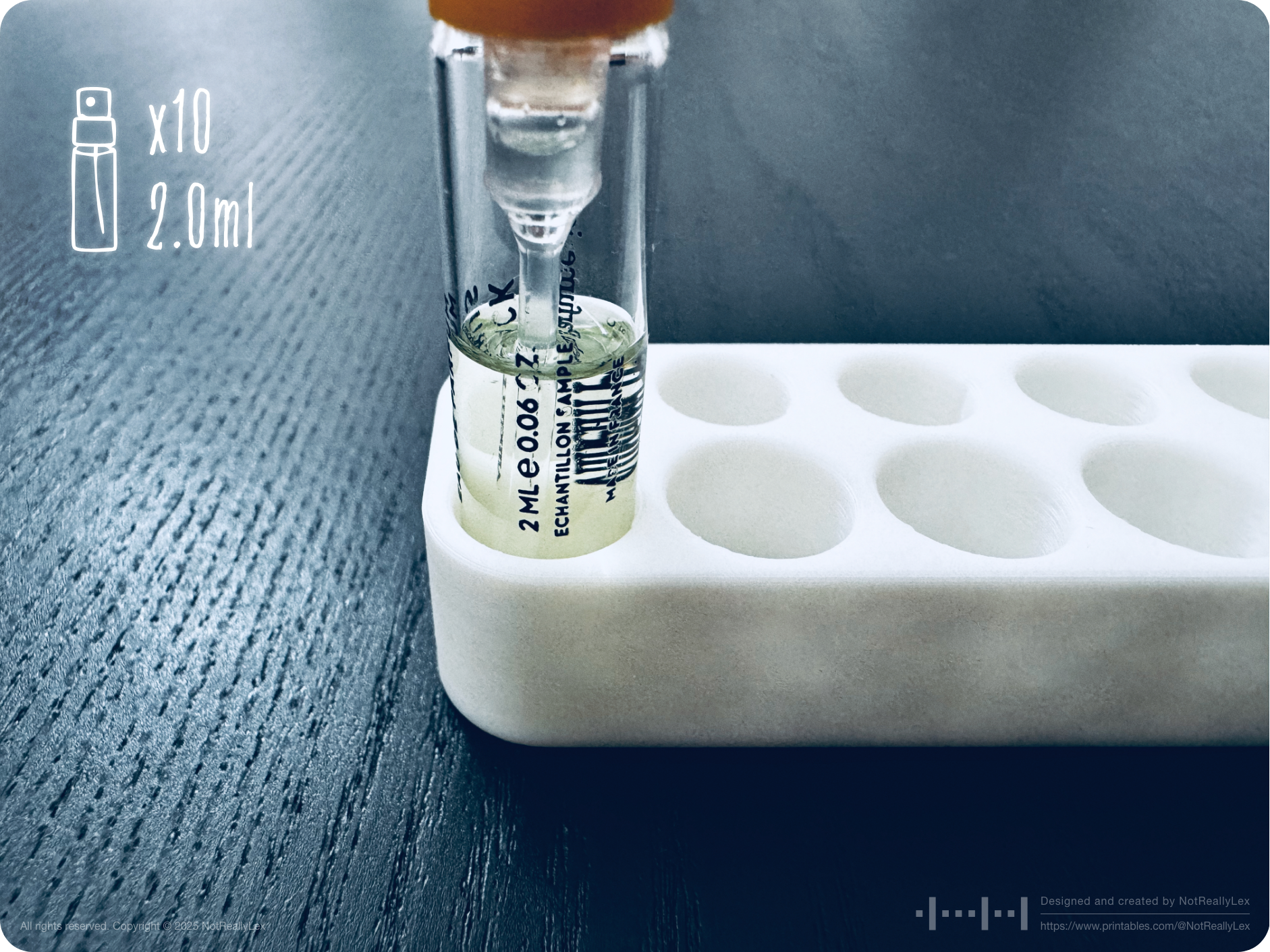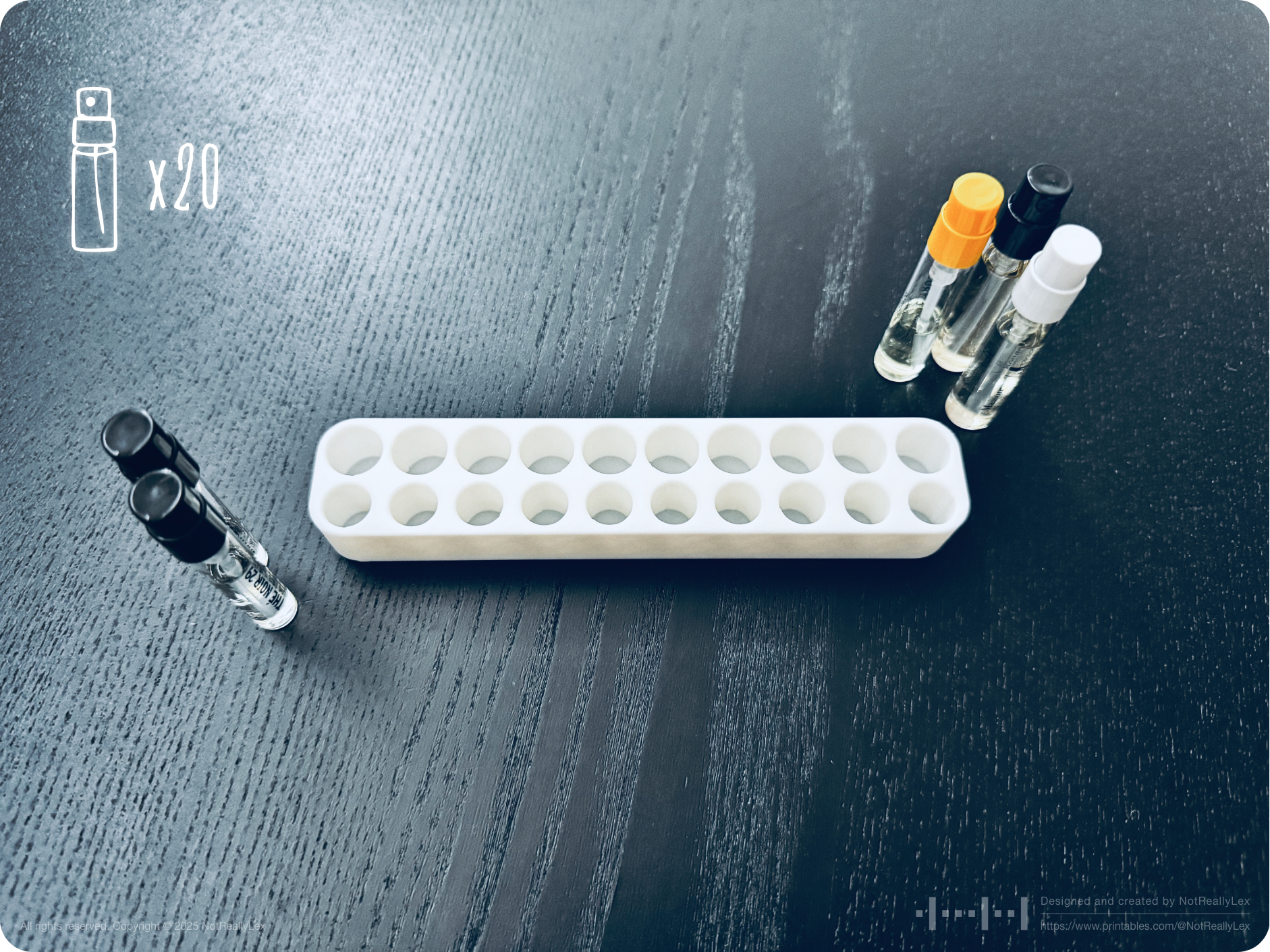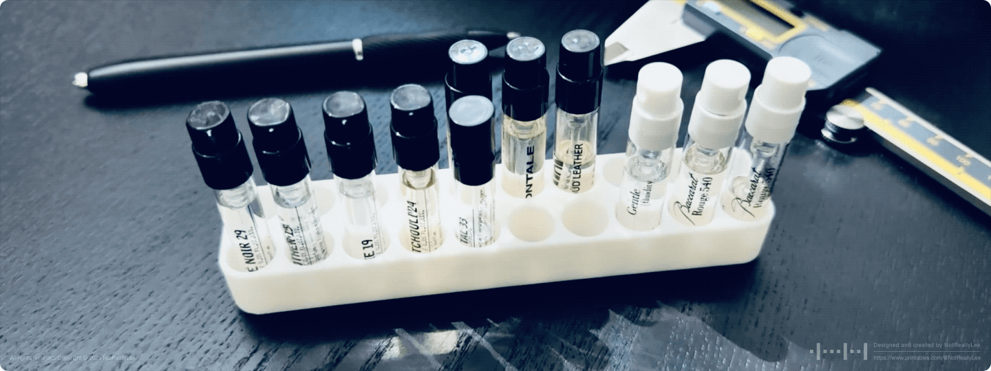Enough was enough, so I designed this minimalist organizer specifically for standard perfume sample vials: 10 slots for 1.5ml samples and 10 slots for 2.0ml samples. The sleek, smooth design with rounded corners keeps everything stable and organized in one compact holder. Now I can easily grab the whole thing, pick and choose samples without creating a mess, and my vanity shelf stays tidy. No more chasing runaway vials or fishing them out from the sink or behind the toilet!